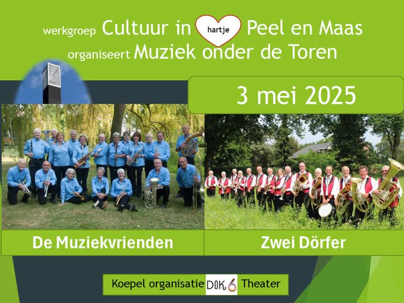 Op zaterdag 3 mei tussen 13.30 en 15.00 uur kun je luisteren naar Blaasorkest De Muziekvrienden uit Boekel. Later op de middag tussen 15.15 en 16.45 uur treedt Blaaskapel 'Die Zwei Dörfer’ Meijel/Neerkant op, een kapel die garant staat voor een middagje genieten van mooie blaasmuziek.