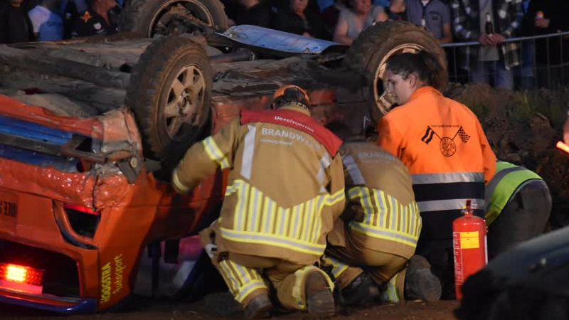 De coureur die zaterdagavond ondersteboven belandde met zijn wagen tijdens de Nachtcross in Baarlo, ...