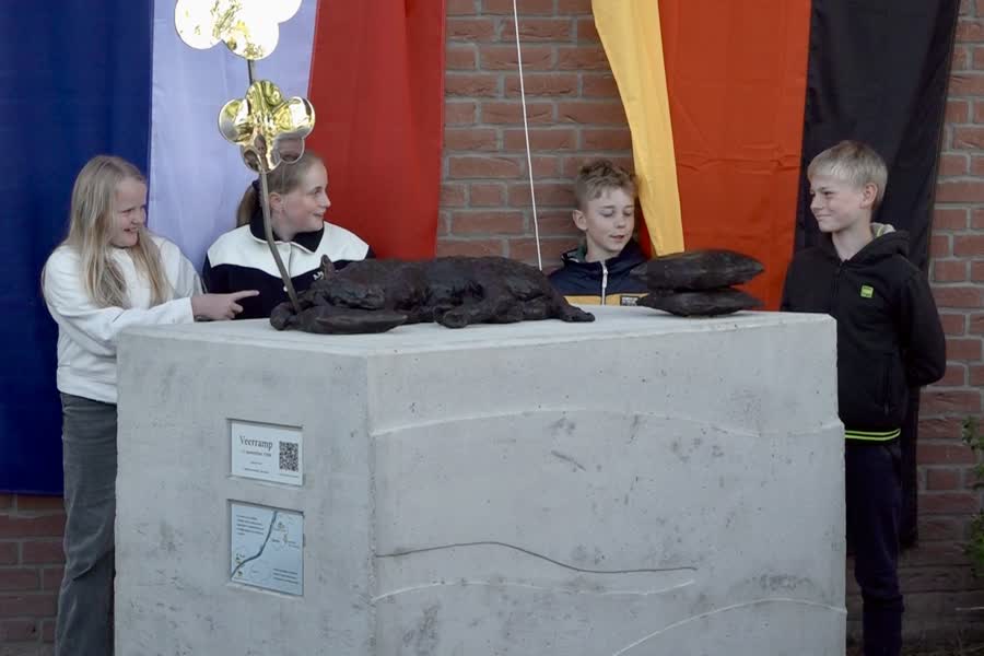 Het onthulde monument in Kessel, met daarachter de kinderen die hebben meegewerkt aan de herdenking.