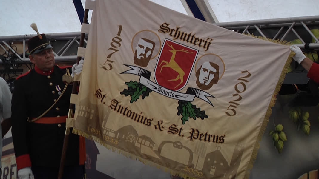 Tijdens de receptie op vrijdagavond, onderdeel van het 150-jarig jubileum van Schutterij St. Antonius & St. Petrus Baarlo, is het nieuwe vaandel van de vereniging onthuld.