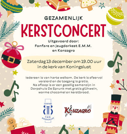 Fanfare en Jeugdorkest EMM en Konzagro voeren een gezamenlijk kerstconcert uit in de kerk van Koningslus...