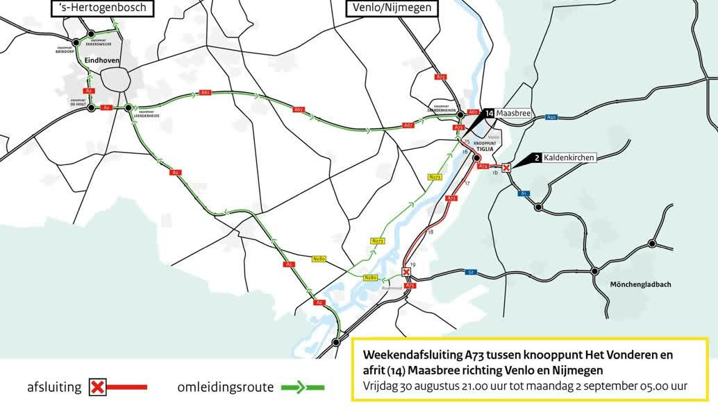 De A73 tussen Vierlingsbeek en Maasbree is volgende week op verschillende momenten afgesloten. Dat z...