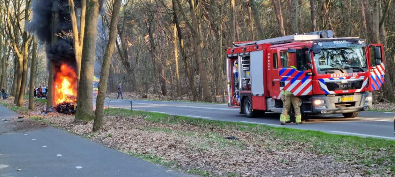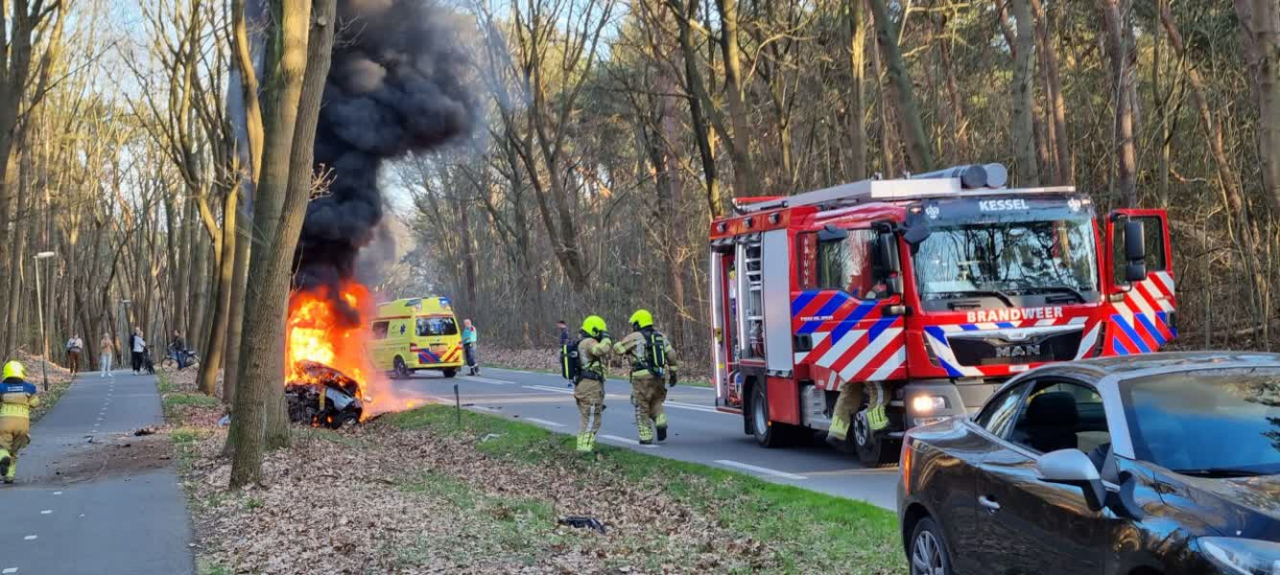De bestuurder reed van de weg en kwam tegen een boom tot stilstand. Hierdoor vatte het voertuig vlam. Vlammen kwamen uit de auto, die in de berm terecht was gekomen. De brandweer werd opgeroepen om het vuur te doven.