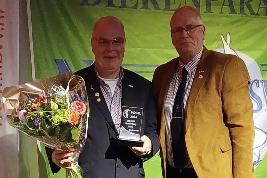 De voorzitter van de Nederlandse Bond van Vogelliefhebbers overhandigde Steegs een glazen standaard. Dat is de prijs voor beste inzender van de gehele tentoonstelling.