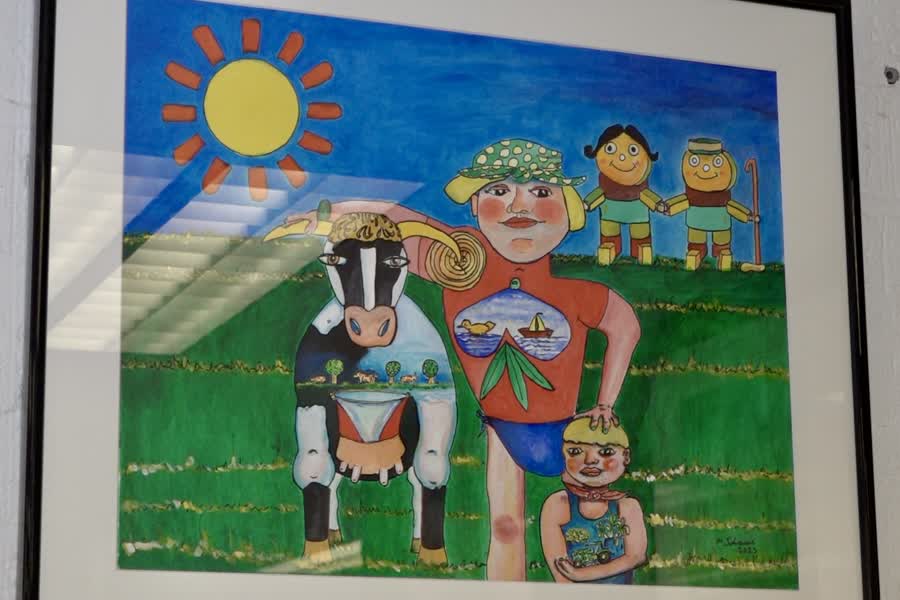 Iedere kunstenaar geeft zijn of haar eigen definitie aan het begrip Over de streep. Sommigen kiezen voor een schilderij speciaal voor blinden en anderen houden het vooral bij de actualiteit, zoals Math Schreurs. Hij schilderde een familie die op een boerderij werkt. “Het boerenbedrijf gaat over van vader op zoon”, legt Math uit. “Met het stikstofbeleid is de toekomst een beetje weg voor de boeren. De man op het schilderij houdt de hand boven het hoofd van het kind, zo van: jij moet het overnemen.”
