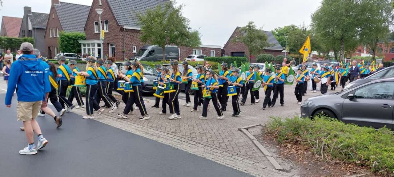 Vele ouders kwamen de straat op om alvast een glimp op te vangen van de Meijelse jeugdschutterij. De kinderen zijn de afgelopen maanden begeleid door de leden van schutterij Sint Nikolaas en schutterij Sint Willibrordus. De kleuren op de uniformen zijn van beide schutterijen: geel, groen én blauw.