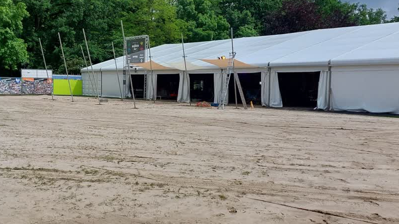 De organisatie van de Volksfeesten in Baarlo heeft vrijdag hard gewerkt om het natte grasveld begaan...