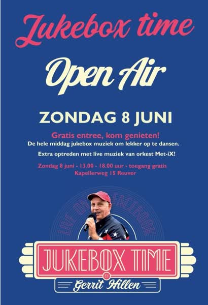 De jukebox staat die dag de hele middag op de Kapellerweg 15 in Reuver. Naast de jukebox is er ook een liveoptreden van het orkest Met-iX! Het event vindt plaats op Zondag 8 Juni tussen 13.00 en 18.00. Mensen kunnen kosteloos terecht, om te komen dansen, luisteren en genieten van muziek in de buitenlucht.