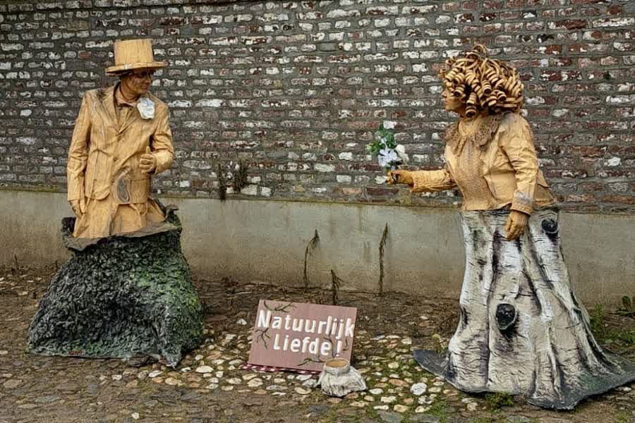 De levende standbeelden van C.O.M. Meijel voeren hun voorstelling 'Natuurlijk Liefde' op. foto: C.O.M. Meijel