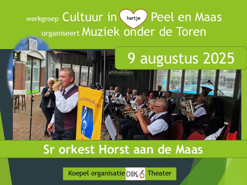 Op zaterdag 9 augustus kun je de hele middag (13.30 tot 16.45 uur) genieten van Seniorenorkest Horst aan de Maas, een welbekende kapel onder de Toren.