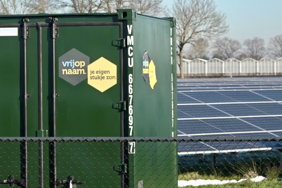 Aan de rand van het zonnepark van het bedrijf Vrijopnaam staat een grote groene container waarin de megabatterij zit. “Met deze opslag kunnen wij 1 miljoen kilowattuur van de middag naar de avond brengen. De zonnestroom gaat niet verloren, maar wordt in de avond door onze klanten gebruikt,” vertelt Bas Wijnen, directeur van Vrijopnaam.