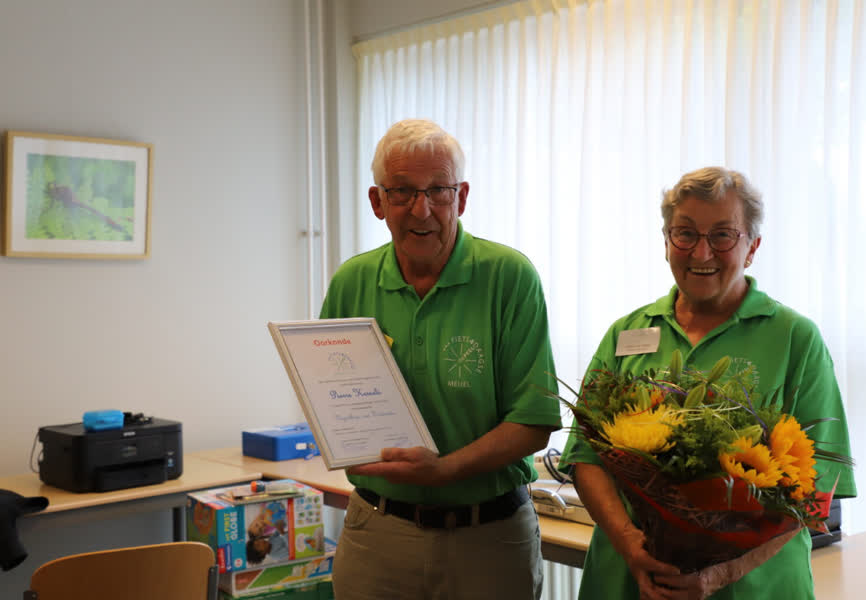 Tijdens de evaluatiebijeenkomst op de laatste dag van Fiets4Daagse De Peel is Gerrie van Hoof postuu...