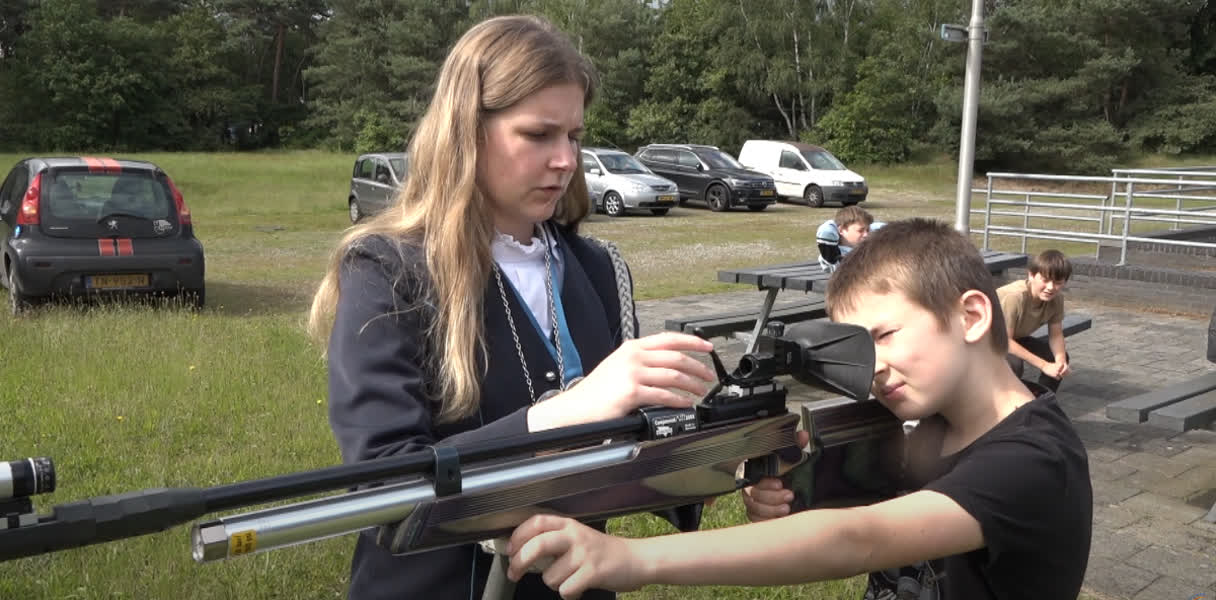 Veerle geeft de jeugd tips om met de luchtbuks te schieten. Daarbij hoopt ze dat de jongeren doorgroeien om straks ook te schieten tijdens het OLS. Volgend jaar wordt de in America wonende Van Zaldelhof secretaris van de schuttersbond.