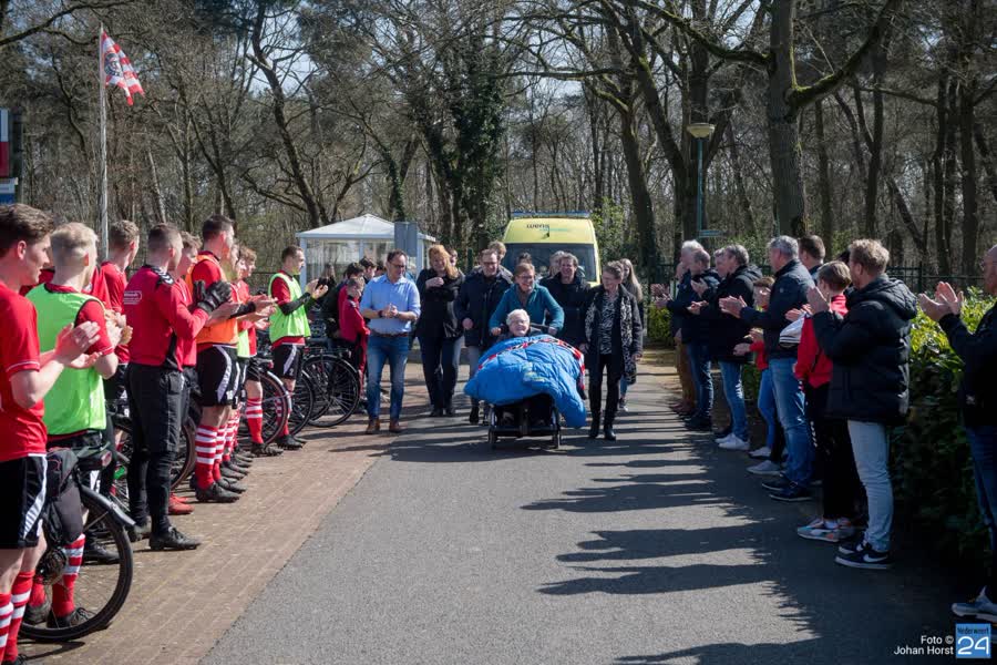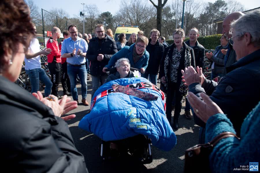 Haar laatste wens ging zondag in vervulling. Nog één keer een voetbalwedstrijd van het eerste elftal kijken. De wensambulance haalde Mia bij Zorgcentrum Sint Jozef op. Onder luid applaus werd ze zondag door tientallen fans, spelers en familie warm onthaald met een erehaag.