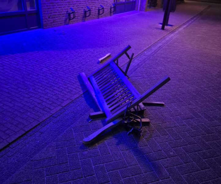 Dit bankje stond tegen de gevel bij Bakkerij ’t Bölke en was vastgemaakt aan het fietsenrek aan de muur. Het bankje werd zondagochtend vernield aangetrokken. Het fietsenrek is door vandalen uit de muur getrokken en het bankje lag in stukken op de grond.