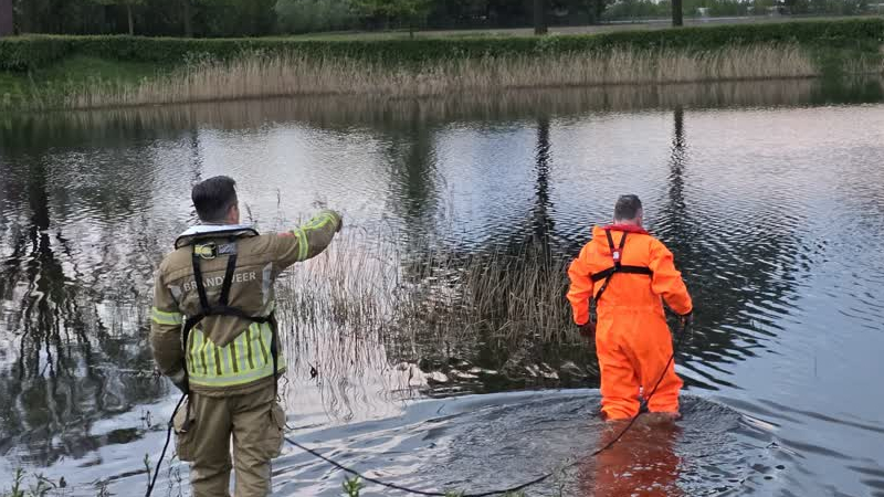 De brandweer heeft zondagavond een eend moeten bevrijden die vast was komen te zitten in een visvijver a...