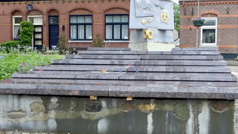 Met granieten bladen worden de maastrappen uitgebeeld op het historisch kunstwerk in Baarlo. Dat is secu...