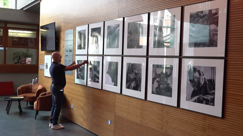 Tientallen foto's van werken van kunstenaar Erik Kierkels hangen in de foyer van DOK6. Bronzen beelden, ...