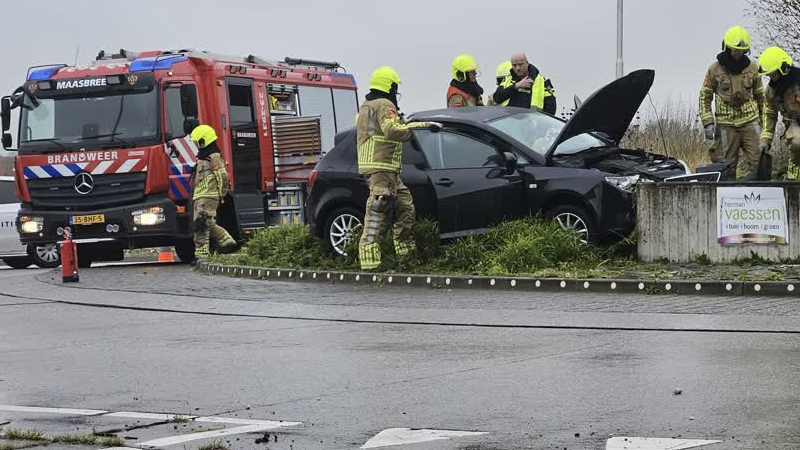 Een personenauto heeft dinsdag de bocht op een rotonde in Maasbree gemist. De auto belandde in de struik...