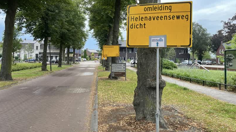 De Helenaveenseweg in Grashoek blijft vijf weken langer afgesloten vanwege werkzaamheden. Volgens de pla...