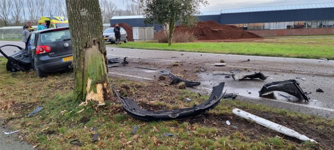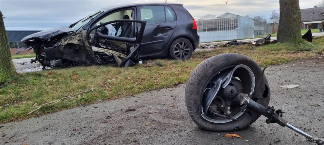 Brokstukken liggen verspreid over de weg. De weg werd afgesloten totdat het onderzoek werd afgerond.