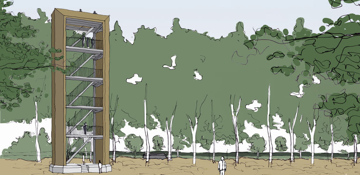 De officiële ingebruikstelling van Belfort Vossenberg staat gepland op zaterdag 3 mei. Afgelopen maandag zijn de werkzaamheden aan de uitkijktoren boven de Peel hervat. Ketelaars Laswerken heeft het bordes geplaatst en bouwbedrijf Stammen is de houten zijpanelen aan het plaatsen.