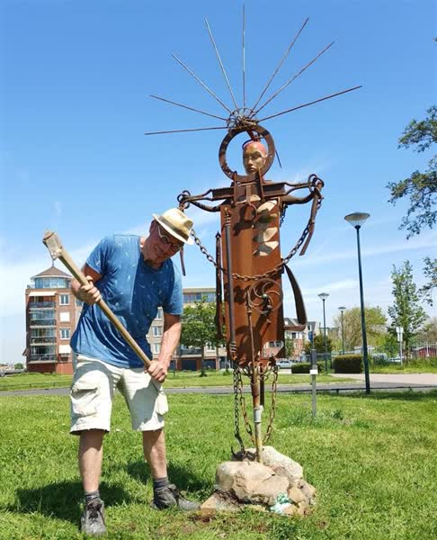 Kunstwerk De Madonna van Jos Beurskens uit Beesel, heeft veel ophef veroorzaakt in Hoorn vanwege een bloederig effect. Dat is per toeval ontstaan bij het herstellen van het beeld voor de expositie.Het beeld, dat op Vissereiland bij Hoorn in een kunstroute stond, werd binnen 48 uur verwijderd omdat het door inwoners werd gezien als 'aanstootgevend'.GlimmenderDe rode gloed op de Madonna, gegoten in een harnas van verroest ijzer, hoort eigenlijk niet bij het beeld. Maar omdat het kunstwerk wat afbladderde werd een rode kleur zichtbaar. Beurskens smeerde dat in met een soort kit, waardoor het begon te glimmen. "Het leek daardoor net of het bloed was", zegt maker Jos Beurskens.OproepDe kunstenaar snapt de commotie niet helemaal. Aanvankelijk had de organisatie zelfs een ander, groot kunstwerk van Beurskens op het oog. "Ik had gereageerd op een oproep in BK-informatie, een vakblad voor beeldende kunstenaars", vertelt de Beeselnaar. "Ze zochten grote beelden voor een kunstroute in Hoorn."Drie elementenBeurskens stuurde foto's van een beeld dat uit drie elementen bestaat op. "Na de inzending kreeg ik meteen reactie dat ze geïnteresseerd waren in mijn werk." Maar de organisatie wilde maar één onderdeel. "Ik heb gemaild dat de drie elementen bij elkaar horen. Toen zeiden ze: 'oeh, dan zijn we bang dat het aanstootgevend wordt voor de bevolking hier in Hoorn'."AanstootgevendDie gedachte kon de beeldende kunstenaar niet helemaal volgen, maar dit voorjaar kwamen ze bij hem terug en kozen de Madonna uit om tentoon te stellen. "Als je dat al aanstootgevend vindt, dan zit de Madonna wel dichter in de buurt. Ondanks dat ik dat zelf niet zo vind, maar iedereen ziet dat toch op zijn eigen manier."VerplaatstHet beeld is inmiddels verplaatst naar een binnentuin van een museum in Hoorn. "Dat is ook omheind en zo heeft men meer zicht op het beeld zelf." Dat moet volgens Beurskens voorkomen dat vandalen het kunstwerk gaan vernielen. "Als het niet helemaal hun smaak is dan wordt vaak gedacht om iets te vernielen, want 'ik vind dat lelijk en mag dat kapotmaken'."