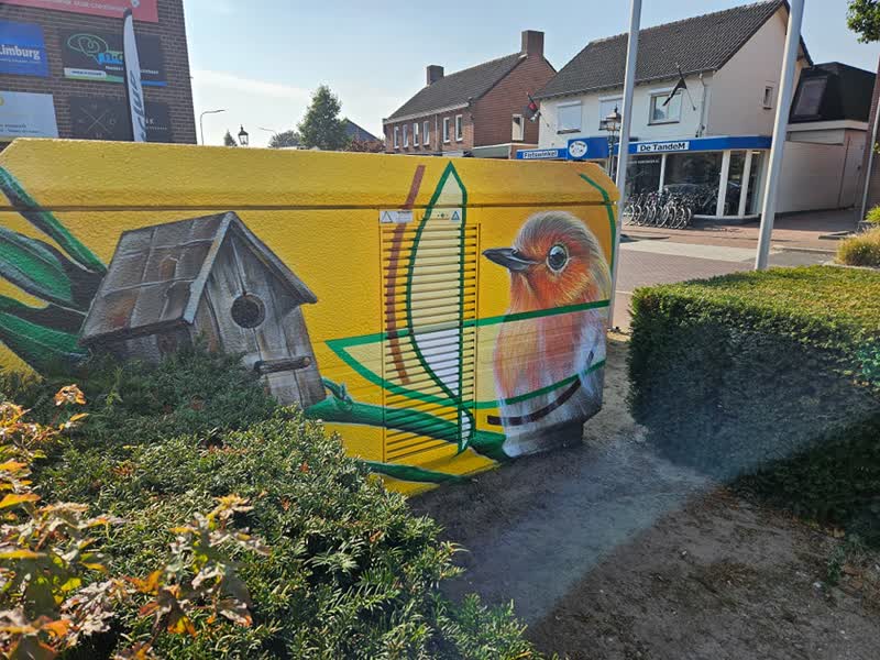 Kunstenaars Marcus Debie heeft opnieuw de openbare ruimte van Panningen opgefleurd met een werk. Na de muurschildering op een flatgebouw, heeft de kunstenaar uit Sittard nu een transformatorhuisje beschilderd.