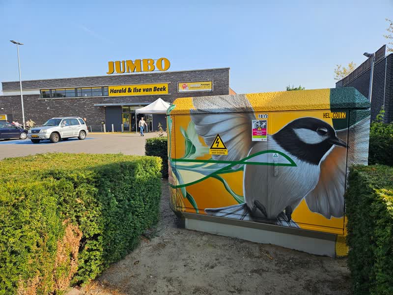 Op het huisje staan verschillende vogels, een vogelhuisje en bloemen. Onder andere een roodborstje schittert op het werk aan de Kerkstraat, op het parkeerterrein van Jumbo Panningen.