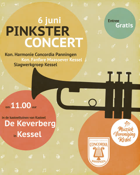 Muziekvereniging Kessel en Koninklijke Harmonie Concordia uit Panningen organiseren gezamenlijk een Pinksterconcert in de kasteeltuin bij Kasteel De Keverberg in Kessel op maandag 6 juni.