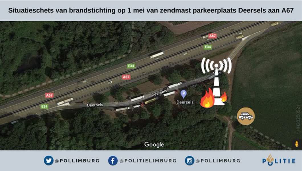 Een donkerkleurige auto is kort na de brandstichting bij zendmast weggereden. Dat blijkt uit politieonderzoek over de brandstichting van een zendmast op parkeerplaats Deersels aan de autosnelweg A67. De recherche vraagt het publiek om mee te helpen in het onderzoek naar deze auto en om informatie over de mogelijke vluchtroute te delen.