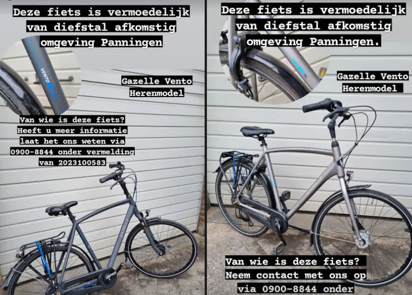 De politie is op zoek naar de eigenaren van twee fietsen die vermoedelijk van diefstal afkomstig zijn. Het betreft een herenmodel van twee Gazelle Vento fietsen.