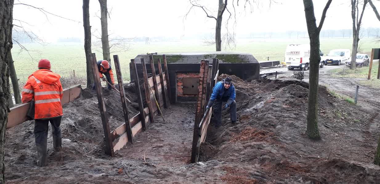 Voor de winter had het bedrijf het hout bij elkaar, maar gooiden de winterse omstandigheden roet in het eten. Inmiddels is de klus wel geklaard en zijn de loopgraven voorzien van houtwerk.