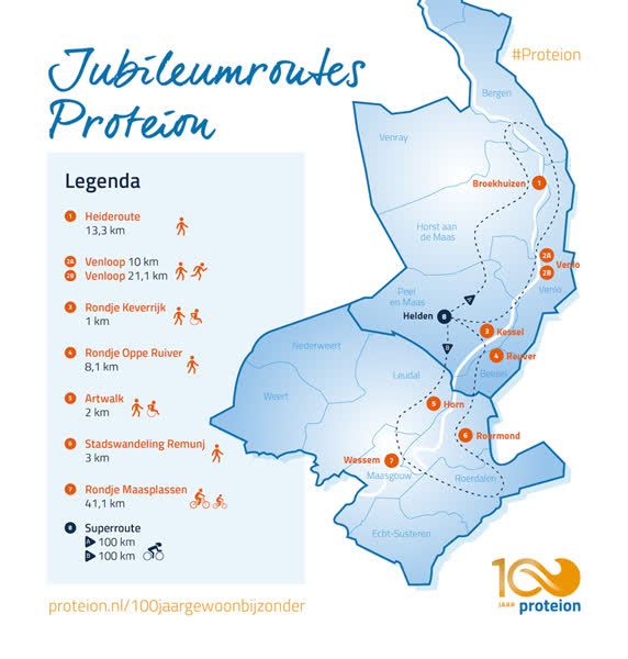 Ter ere van haar 100-jarig bestaan presenteert Proteion 8 wandel-, hardloop- en fietsroutes door Noord- en Midden-Limburg. Iedere route kent een persoonlijk verhaal van een medewerker of vrijwilliger van Proteion.Meer info over de 8 jubileumroutes en verhalen zijn te vinden en te downloaden via: https://www.proteion.nl/jubileumroutes . Loop, wandel of ren je een leuke route? Post dan een foto op social media met de vermelding #Proteion.Behalve dat het ontspant past wandelen, hardlopen, fietsen oftewel gewoon lekker bewegen, bij een gezonde leefstijl en gezond ouder worden. Proteion vindt het belangrijk hieraan bij te dragen, iedere dag weer.