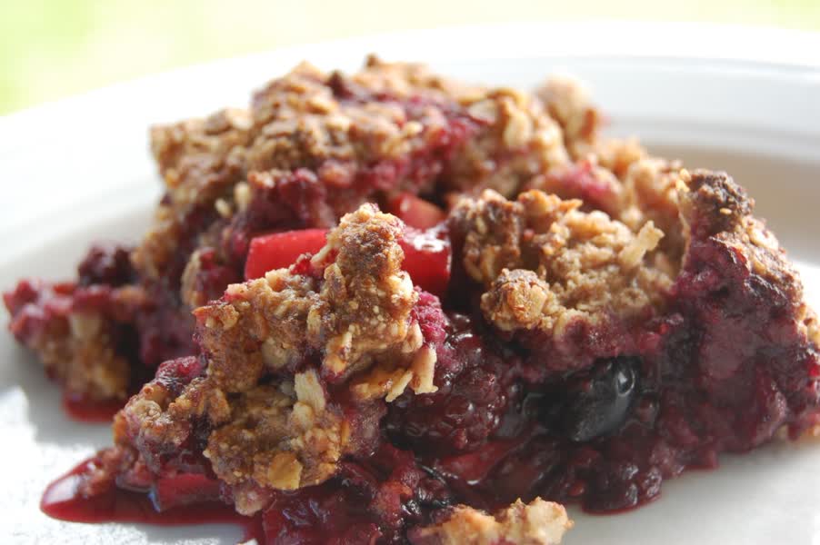 Neem een gesloten bakvorm die niet kan lekken. Verdeel het fruit over de bodem en strooi het deeg eroverheen. Verdeel dit gelijkmatig. Bak de crumble ongeveer 30 minuten in de oven totdat de bovenkant mooi goudgeel begint te worden.