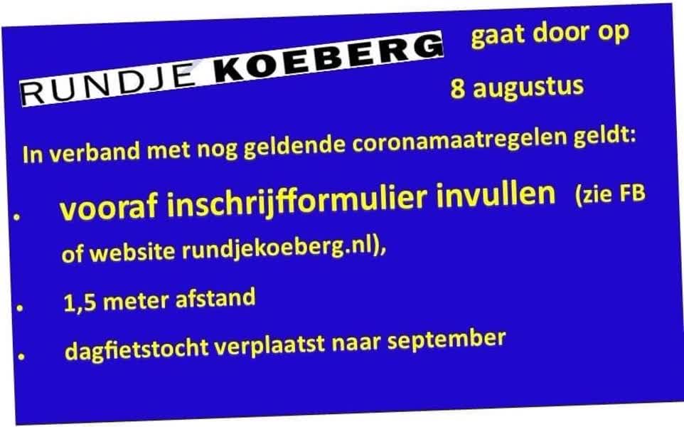 Rundje Koeberg biedt zondag 8 augustus weer het vertrouwde programma:Wandelen 5, 10 en 15 km;Hardlopen 5, 10 en 15 km;Recreatief fietsen 25 km.Door de nog geldende coronamaatregelen moet vooraf het inschrijfformulier worden ingevuld. Kijk hiervoor op FaceBook of op www.rundjekoeberg.nl . Alle activiteiten vinden plaats vanuit Dorpscentrum Kerkeböske, Aan de Koeberg 3 in Helden. De dagfietstocht is verplaatst naar zondag 12 september.Rundje Koeberg is een sportief evenement dat elke tweede zondag van de maand in de Heldense bossen bij Helden wordt gehouden. Je kunt sporten op eigen niveau, met of zonder begeleiding, individueel of in groepsverband. Het evenement is tot stand gekomen onder het motto 'inspannen en daarna ontspannen en ontmoeten'. Rundje Koeberg is een initiatief van drie Heldense sportverenigingen: Atletiek Helden, Pareja en Toerclub Everlo; in samenwerking met het Dorpscentrum Kerkeböske in Helden.