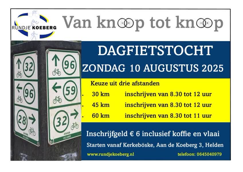 De organisatie van Rundje Koeberg is nog op zoek naar enkele vrijwilligers die op zondagmiddag of maandagmorgen de routepijlen en lintjes willen ophalen. Heb jij nog tijd over en wil je hierbij helpen, neem dan contact op met Hub Gielen (06-311 909 31) die het plaatsen en ophalen van de routeborden coördineert, of meld je aan bij de inschrijftafel.
