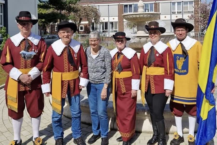 Dré Janssen (tweede van links) naast zijn vrouw Thea en de delegatie van het Koninklijke Schuttersgilde Sint Lambertus foto: Koninklijke Schuttersgilde Sint Lambertus / Facebook