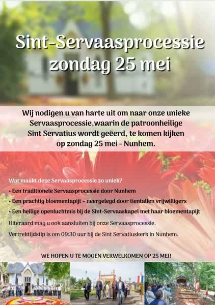De processie vertrekt om 09.30 uur bij de Sint Servatiuskerk in Nunhem. Door tientallen vrijwilligers is een kleurrijk bloementapijt neergelegd. Het bloementapijt en de Servaasprocessie horen bij de Servaasverering in Nunhem.