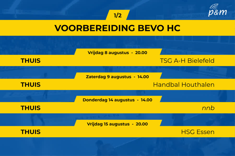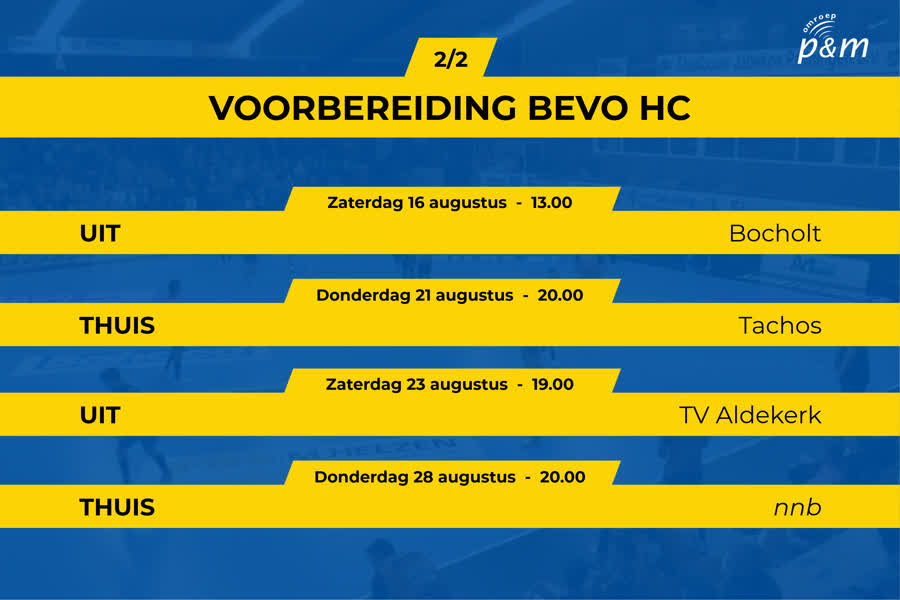 Het voorseizoen wordt op donderdag 28 augustus afgesloten met een laatste oefenduel in De Heuf. De tegenstander voor die wedstrijd is nog niet bekend. Op 6 september begint voor Bevo het nieuwe seizoen officieel met de eerste wedstrijd in de Super Handball League. De Panningenaren gaan dan op bezoek bij Handbalclub Izegem uit België, niet ver van de Franse grens. De week erna staat de eerste thuiswedstrijd gepland, tegen Hellas.