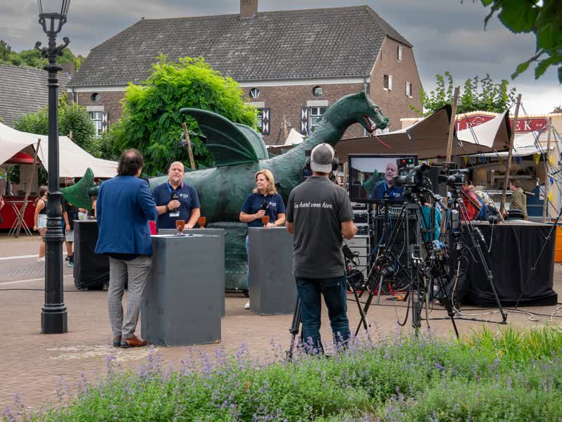 Op de Markt in Beesel blikt Pascal Meyer vooruit op de tweede voorstelling van het Draaksteken. Te gast zijn onder andere spelers, burgemeester Bob Vostermans en gouverneur Emile Roemer.