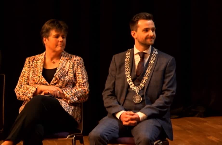 Na het overhandigen van de voorzittershamer kreeg de 30-jarige de rode lantaarn van burgemeester Scholtze van de gemeente Drimmelen. Deze lantaarn staat voor de jongste burgemeester van Nederland.