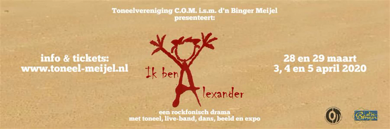 Ik ben Alexander, een rockfonisch drama met toneel, live-band, dans, beeld en expo. Zoals de volledige titel luid is de nieuwe theaterproductie van toneelvereniging C.O.M Meijel i.s.m. gemeenschapshuis d'n Binger Meijel. Ik ben Alexander is een op waarheid gebaseerd verhaal dat door Bertine van Heugten en Lisette Leenders geschreven is. De regie is in handen van Lisette Leenders. Locatie: Gemeenschapshuis d'n Binger Meijel (alexanderplein 2). Tickets zijn verkrijgbaar via www.toneel-meijel.nl én bij het VVV/Peelpunt in Meijel (Raadhuisplein 8)