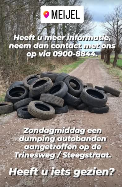 De politie tast in het duister wie de banden heeft gedumpt en vraagt inwoners die tips hebben, zich te melden. Er kan contact opgenomen worden met 0900-8844.