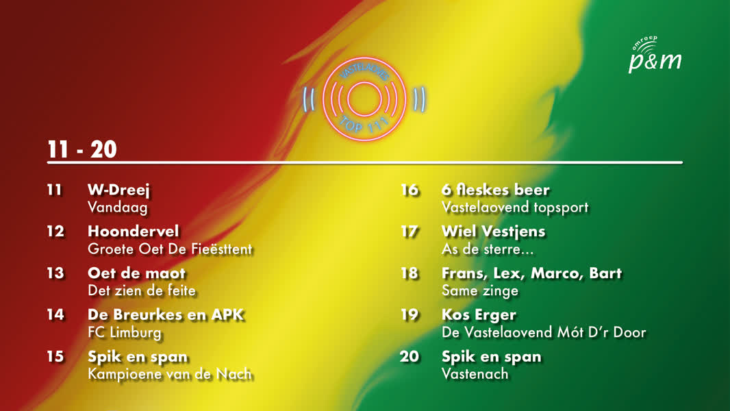 Omroep P&M zond de Top 111 vrijdag voor de achtste keer uit. Vorig jaar stond ‘FC Limburg’ van De Breurkes & APK-Side op één. Dat was de eerste keer dat een artiest uit Peel en Maas de eerste plek behaalde in de vastelaoveshitlijst.