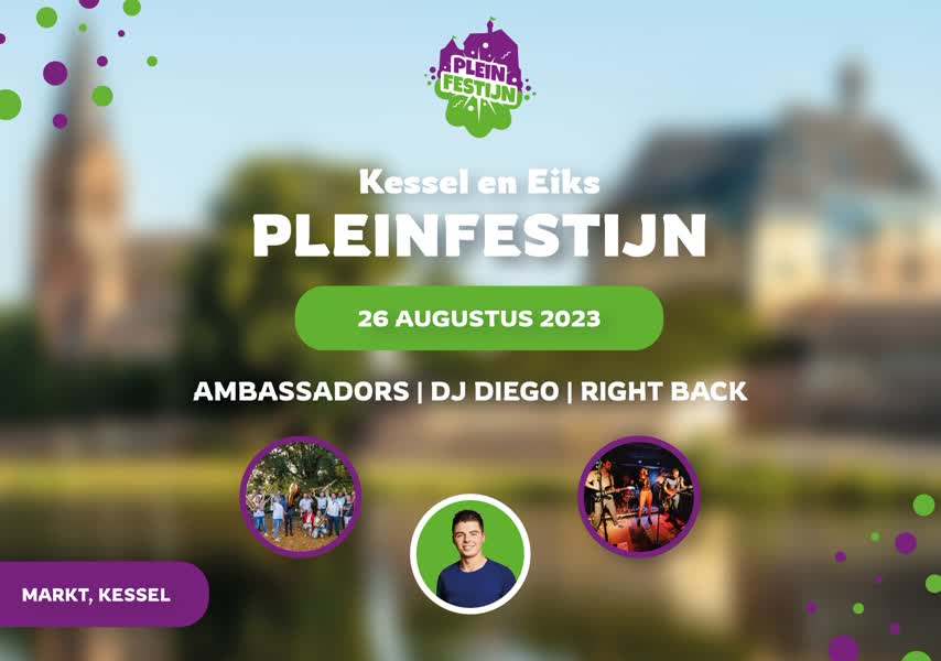 De locatie van het Pleinfestijn is de Markt in Kessel. Op het podium staan vanaf 17.00 de Kesselse Bigband The Ambassadors van Muziekvereniging Kessel, daarna de lokale rock en popband Right Back, aangevuld met Kesselse en Kessel-Eikse artiesten. Feest DJ Diego zal de avond afsluiten.