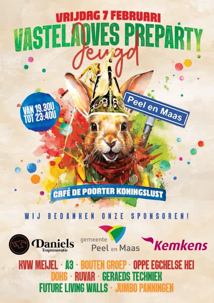 De tweede editie van de Vastelaoves Preparty voor de jeugd in Koningslust is vanavond uitverkocht. Van 19.30 tot 23.40 uur vindt het evenement plaats in Café De Poorter.