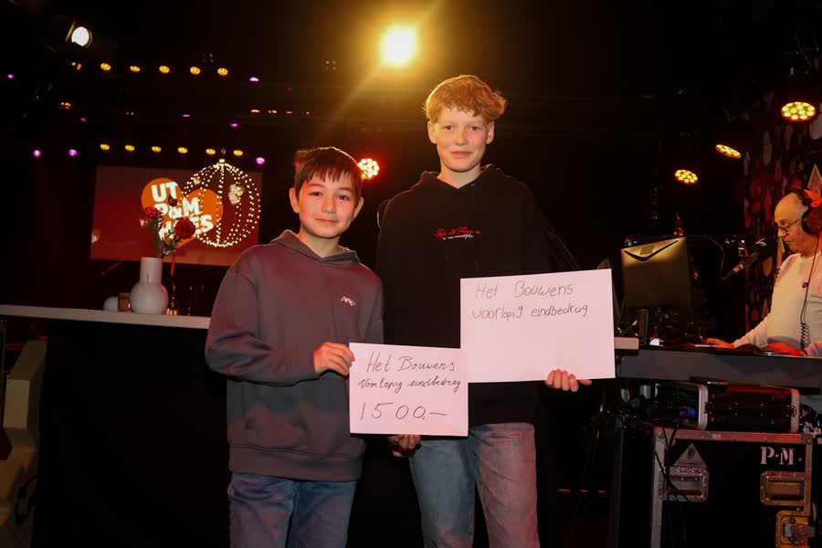 In het theater van DOK6 kwamen twee leerlingen van Het Bouwens een voorlopig eindbedrag afleveren. Tot vrijdagmiddag was er 1500 euro opgehaald.