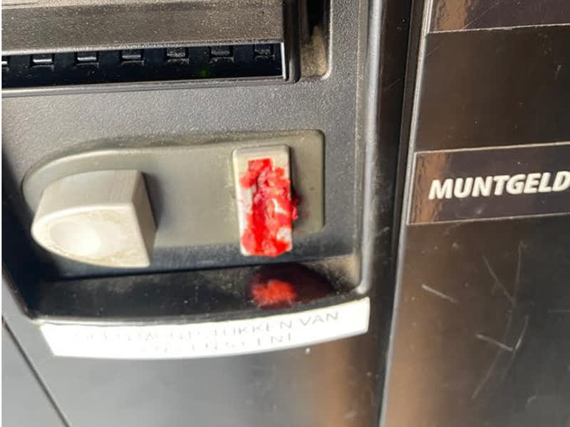 Op foto's is te zien dat de automaat besmeurd is met geplette aardbeien. Via Facebook roept Lemmen getuigen op om zich te melden.
