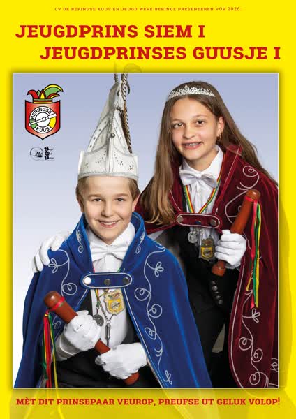 Ook de jeugdheersers zijn bekend gemaakt. Dat zijn jeugdprins Siem Linders en jeugdprinses Guusje van Heugten. Hun spreuk is: “Mèt dit prinsepaar veurop, preufse ut geluk volop!”